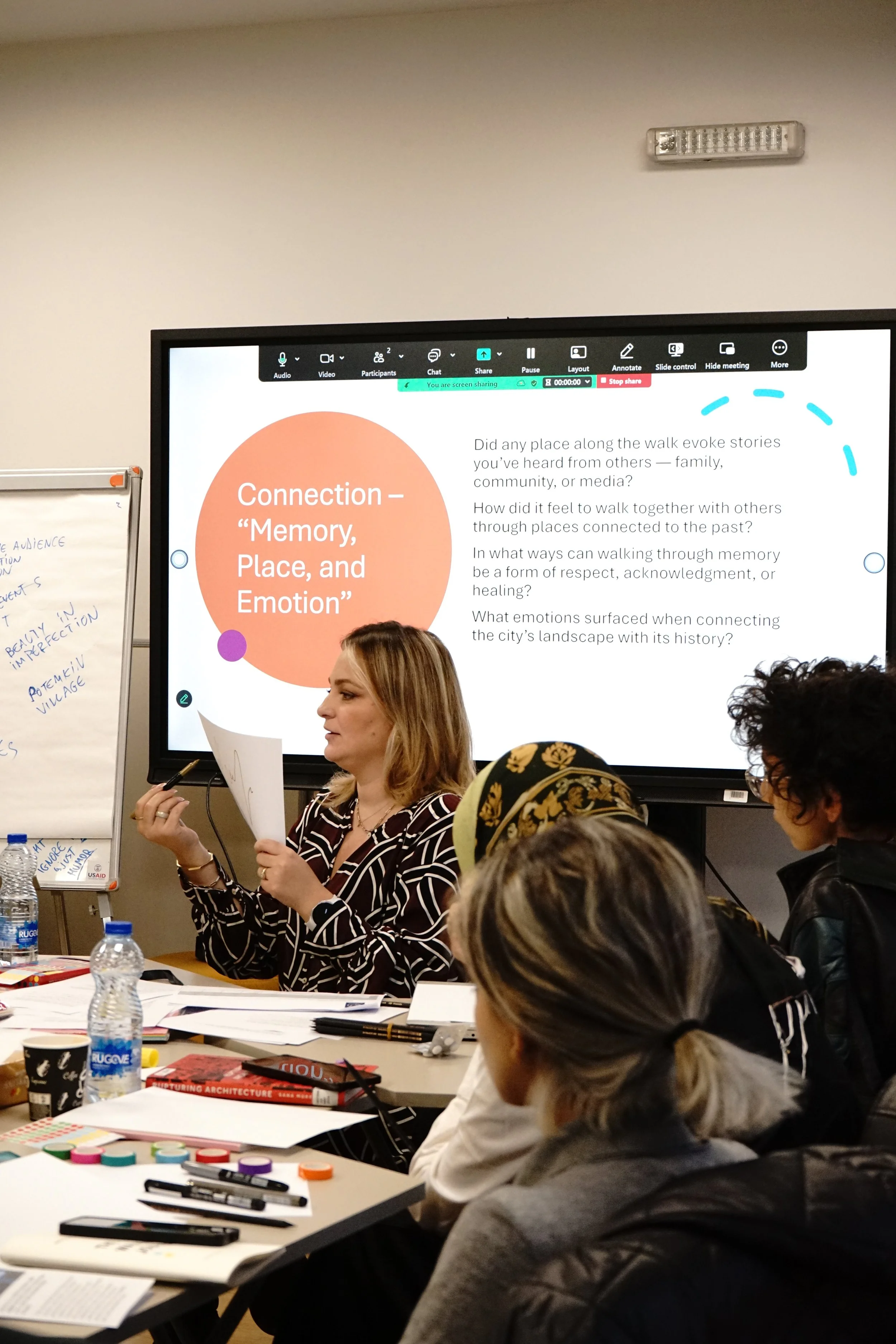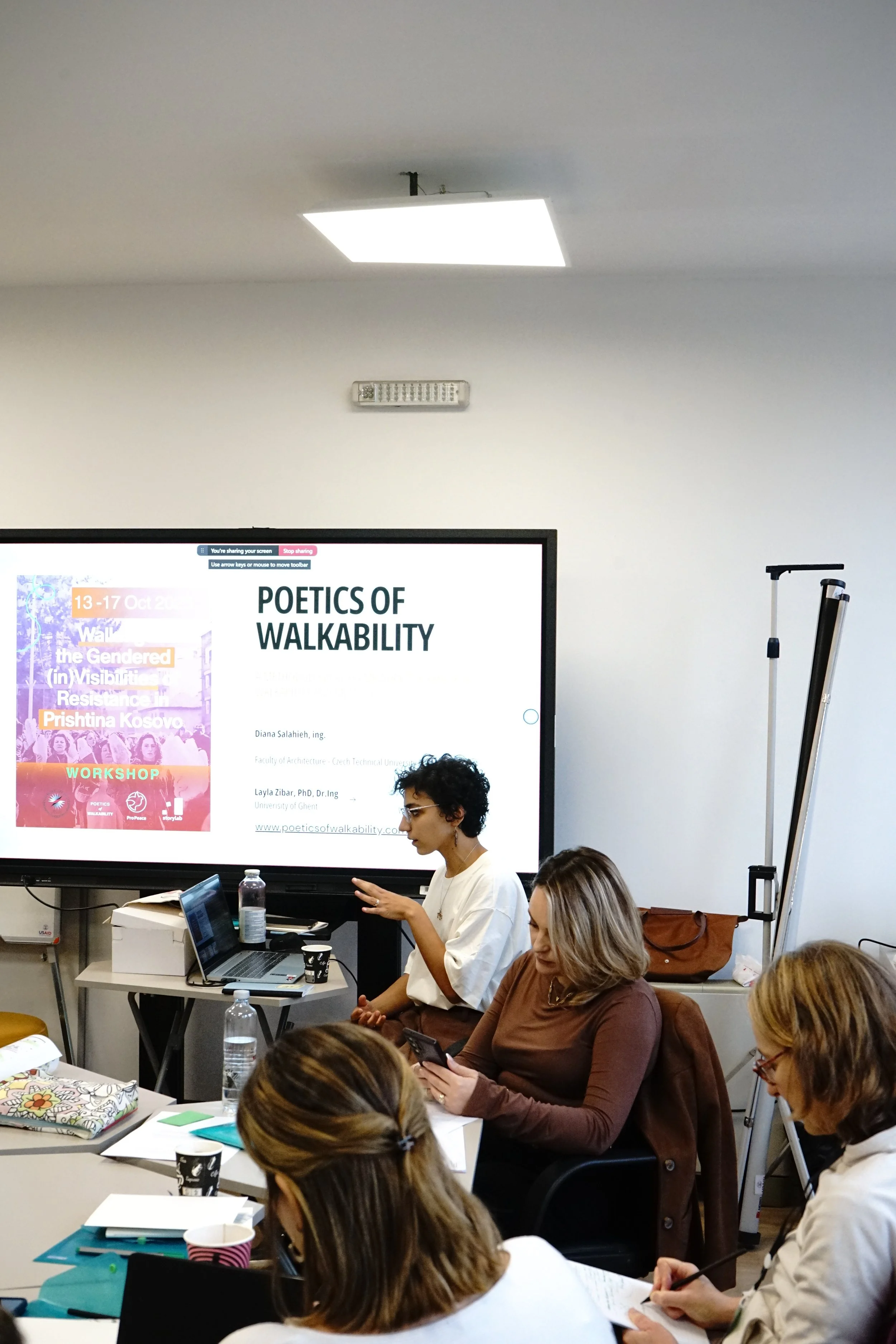 Participants engaged in lectures, exploratory walks, creative movement, and guided writing sessions that approached walkability as both a method and a lens for uncovering suppressed or overlooked memories of gendered resistance and activism. Adopting this framework, participants examined how shared, contested, and gendered memories are made visible—or remain invisible—within Prishtina's everyday footpaths and public spaces.